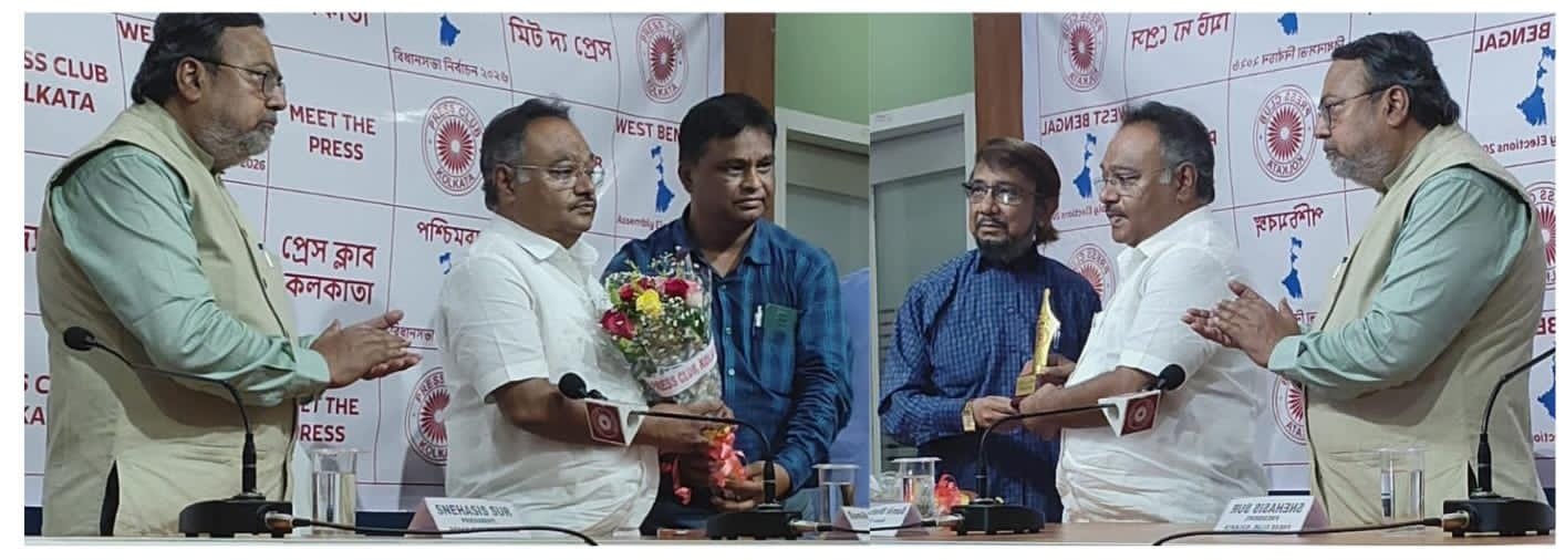 পশ্চিমবঙ্গ রাজ্যে আসন্ন বিধানসভা নির্বাচনকে সামনে রেখে,অতীতের সমস্ত নির্বাচনের মতোই ধারাবাহিক "মিট-দ্য-প্রেস"১৮ এপ্রিল শনিবার ২০২৬ প্রেসক্লাব কলকাতায় ক্লাবের সভাপতি স্নেহাশিস সুর এর সভাপতিত্বে অনুষ্ঠিত হয়েছে। মিট-দ্য-প্রেস এর প্রধান অতিথি ছিলেন ভারতীয় জনতা পার্টি ,বিজেপি পশ্চিমবঙ্গ রাজ্য সভাপতি শমীক ভট্টাচার্য তাকে ফুলেল শুভেচ্ছা জানিয়ে বরণ করেছেন প্রেসক্লাবের সহ সম্পাদক নিতাই মালাকার। মেমেন্টো দিয়ে বরণ করেছেন অর্থ সম্পাদক অরিজিৎ দত্ত তিনি আসন্ন বিধানসভা নির্বাচনে রাজ্যের বিভিন্ন সমস্যাও সমাধানের কথা উল্লেখ করেছেন। এবং প্রেসক্লাব কলকাতায় দাঁড়িয়ে রাজ্য বিজেপি সভাপতি শমীক ভট্টাচার্য জানালেন,বিজেপি সরকার ক্ষমতায় এলে রাজ্যে সব সাংবাদিককে ৫০০০/পাঁচ হাজার টাকা ভাতা দেওয়া হবে। ভোটের মুখে সাংবাদিকদের এই প্রতিশ্রুতি দিয়ে আশার আলো জাগিয়েছেন তিনি বলেন আমরা ওরা নয়,সব সাংবাদিকই এই সুবিধা পাবেন।
