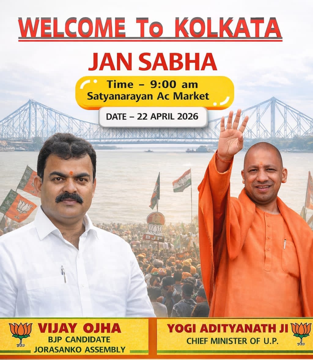 - কলকাতার বানিজ্য ও বনেদি জোড়াসাঁকো ঠাকুরবাড়ি রবীন্দ্রনাথ ঠাকুরের রাজবাড়ী এলাকায় ২২ এপ্রিল বুধবার ২০২৬ সকাল ৯ টায় ভারতীয় জনতা পার্টি বিজেপি মনোনিত প্রার্থী "বিজয় ওঝা-র" সমর্থনে আগমনকে কেন্দ্র করে সাজ সাজ রবে পরিনত হয়েছে।১৬৫ জোড়াসাঁকো বিধানসভার,কলাকার স্ট্রিট,সত্যনারায়ণ এ.সি.মার্কেটের নিকটে,হিন্দু হৃদয় সম্রাট,উত্তর প্রদেশের সফল মুখ্যমন্ত্রী মাননীয় যোগী আদিত্যনাথজি একটি বিশাল জনসভাকে সম্বোধন করবেন। সকলের কাছে অনুরোধ,পরিবার ও বন্ধুদের সঙ্গে এই জনসভায় অধিক সংখ্যায় উপস্থিত থেকে এই সভাকে সাফল্য মন্ডিত করার জন্য অনুরোধ করা হয়েছে।